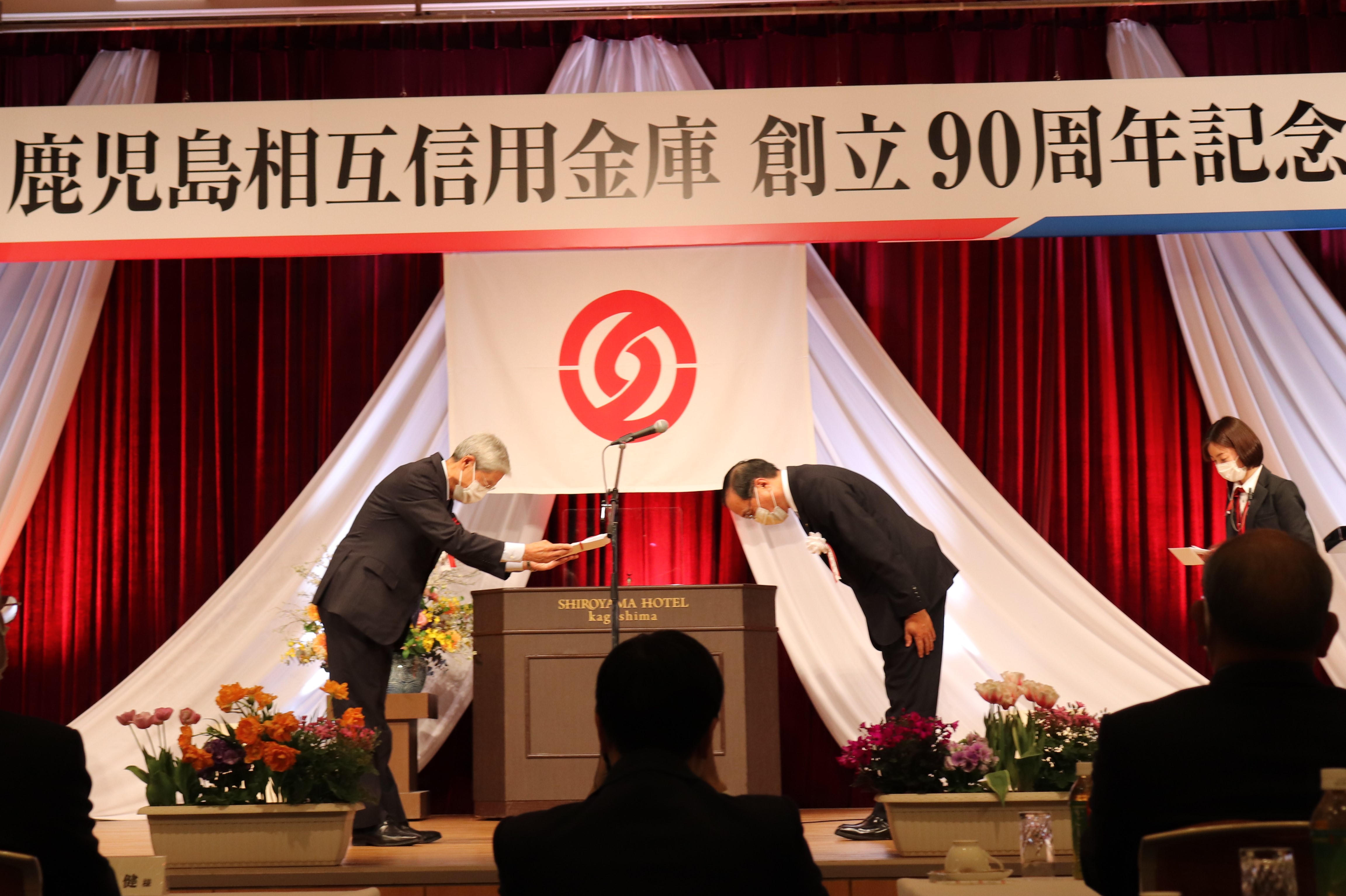 創立90周年記念式典の様子 鹿児島相互信用金庫 理事長 永倉 様(右側)