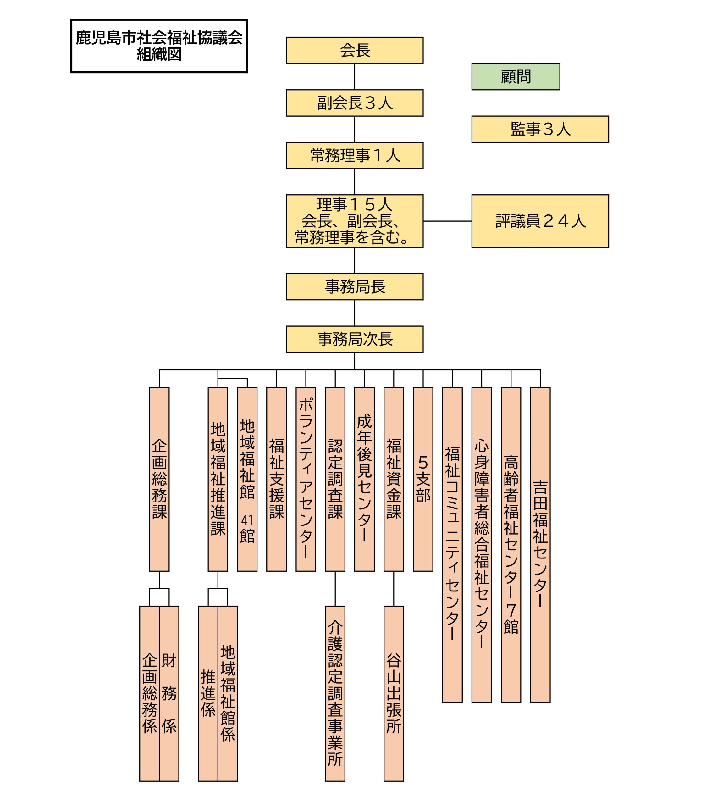 社会福祉協議会は通称”社協(しゃきょう)”といい、社会福祉法で地域福祉を推進する団体として定められ、地域が抱えているいろいろな福祉問題を地域のみんなで考え、話し合い、解決へと結びつけていくことを目的として活動している、公共的な民間の団体です。 社協は、地域で誰もが、いつでも、どこでも、福祉サービスを受けることができるように、きめ細かな福祉事業を進め、市民生活の中での様々な福祉問題を改善向上させ「誰もが安心して暮らせる福祉のまちづくり」を目指しています。 社協の活動は、「福祉のまちづくり」に参加していただいている校区社協の皆様や職域等でご支援いただいている個人の一般会員、社会福祉関係機関・施設・団体、またその職員、学識経験者の皆様等の特別会員、企業や事業所等の法人特別会員・法人会員の皆様を中心に市民の皆様にその活動を支えていただいています。 社協の組織は、校区社協や町内会・ボランティア団体・NPOなどの住民組織や福祉事務所・保健所・教育委員会・老人クラブなど公私の関連分野の関係者、さらに民生委員児童委員協議会・福祉施設・保護司会など福祉の専門家・事業所、団体や企業など幅広いメンバーで構成されています。鹿児島市社協のあゆみ